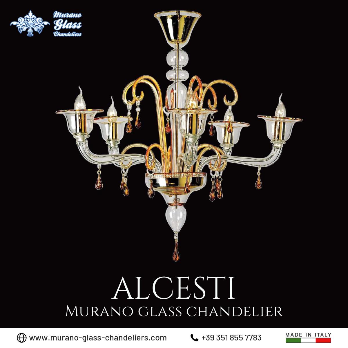 “Alcesti” #Murano glass #chandelier, 5 lights transparent and amber color classic chandelier made in Italy by hand.