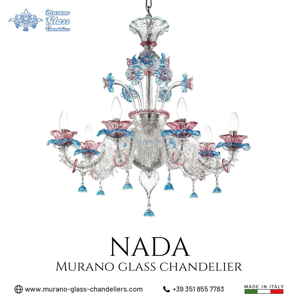 “Nada” #Murano glass #chandelier, 6 lights transparent, pink and blue color traditional chandelier entirely handmade in Italy.